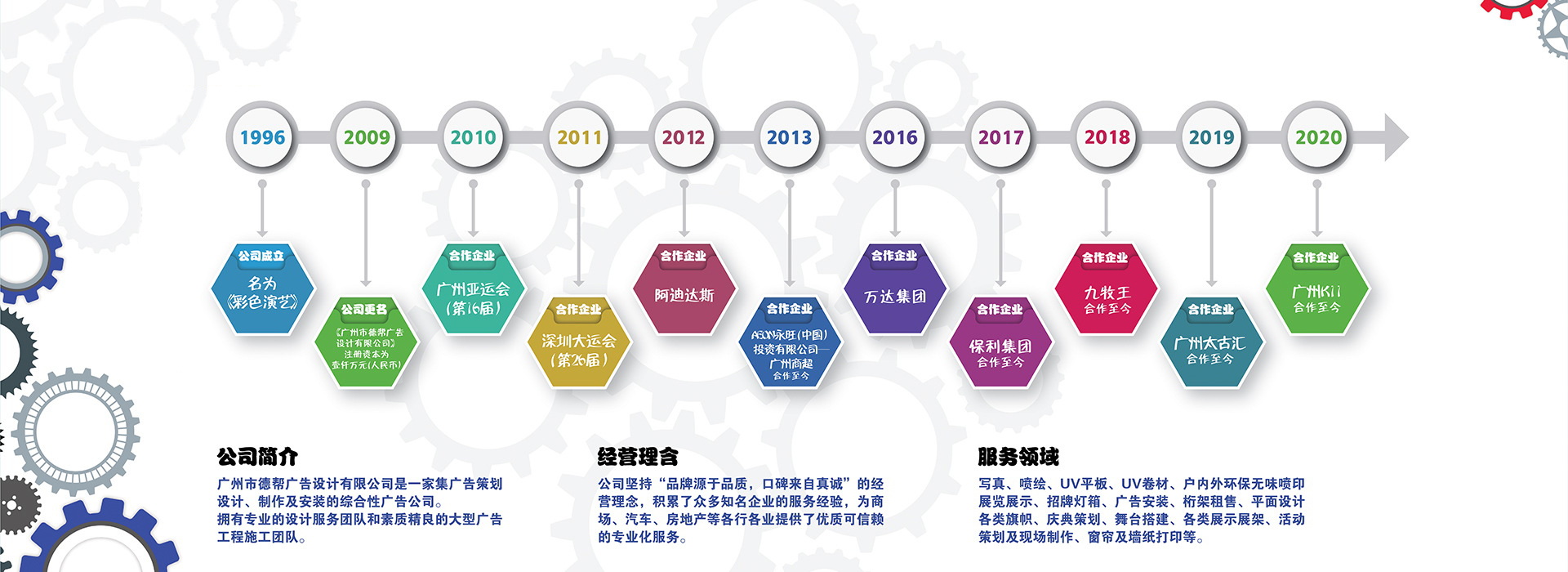 廣州市德幫廣告設計有限公司,是一家集廣告策劃 、設計及制作安裝于一體的綜合性廣告服務商,公司(原彩色演藝噴繪)成立于1996年,公司擁有惠普、愛普生戶內外寫真噴繪機20臺,HP latex環(huán)保乳膠墨水打印機2臺,大噴機10臺,UV平板卷材機6臺,全自動智能切割機4臺等高端設備,專業(yè)的設計制作團隊和素質精良的大型廣告工程施工團隊,廠房面積達3000平米。公司主要經(jīng)營戶內、外寫真、噴繪、廣告工程的制作、平面設計、燈箱、招牌等業(yè)務,公司所有的設備采用進口設備、后期制作自動化,生產速度快、質量第一。與方圓地產、萬達廣場、招商地產、萬科地產合作,主要制作內容:廣告活動物料、圍墻的生產、安裝、桁架的搭建、活動執(zhí)行、高空安裝、燈旗的制作及安裝等業(yè)務。公司先后榮獲廣州地區(qū)十佳廣告工程制作公司、中國商務廣告協(xié)會廣告工程分會會員單位、全國噴繪企業(yè)入圍品牌公司等諸多榮譽。至今已發(fā)展成為華南地區(qū)大型的廣告產品供應基地。并以“產量高、質量好、交貨快”的經(jīng)營模式贏得了廣大客戶的稱贊。并堅持“品牌源于品質,口碑來自真誠”的經(jīng)營理念,積累了眾多知名企業(yè)、政府機構的服務經(jīng)驗,為大型活動、商場超市、汽車、房地產等各行業(yè)提供了優(yōu)質可靠的專業(yè)化廣告服務。旨在協(xié)助客戶提升品牌形象,并以建立長期品牌價值為使命,讓各行業(yè)的品牌形象結合產品推向市場,贏得足夠的社會關注,幫助企業(yè)品牌成長。